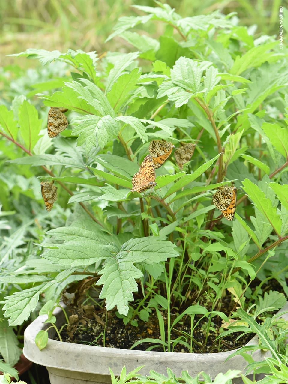 タ ム ラ ソ ウ に 産 卵 す る ヒ ョ ウ モ ン モ ド キ